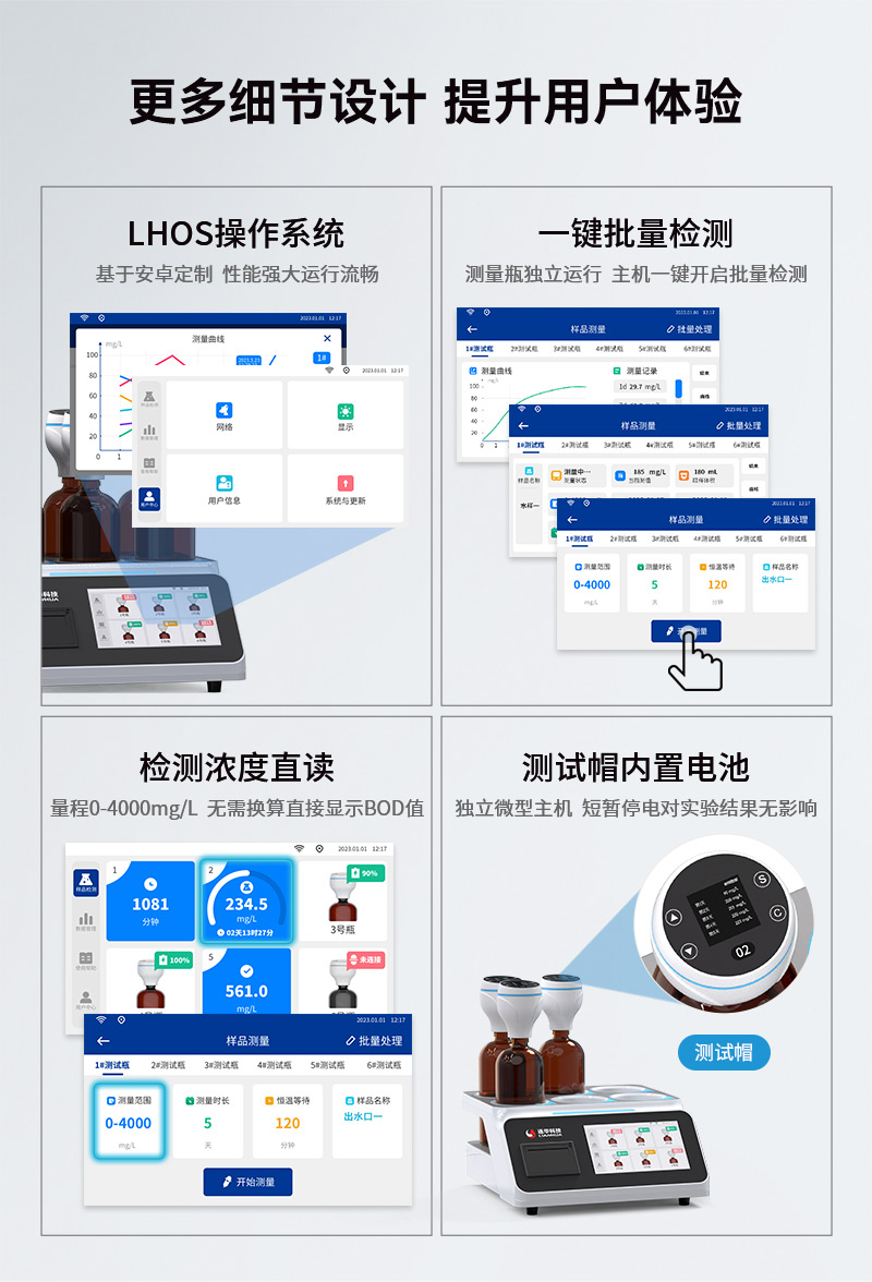 4.量程0-4000mg/L,檢測(cè)濃度直讀,無需換算直接顯示BOD值,采用安卓系統(tǒng)算法更新,硬件升級(jí)低量程測(cè)值更準(zhǔn);