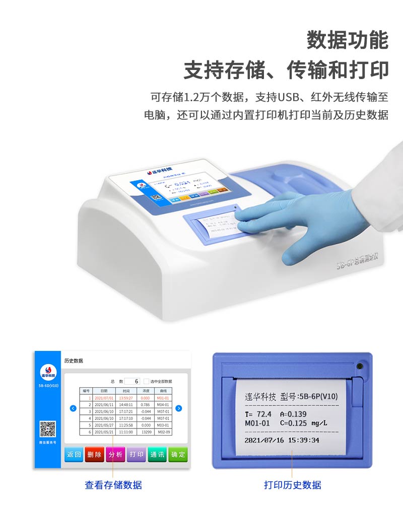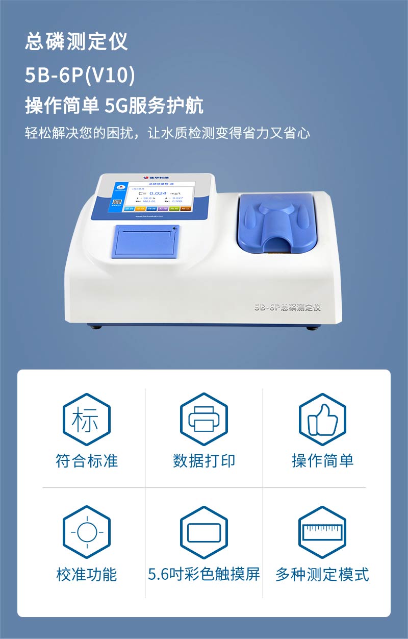 5B-6P(V10)總磷測定儀為實驗室智能型測定儀,精度高,壽命長,更穩定。本儀器可根據水樣濃度的高低選擇不同的測量方式,各個測量項目可一鍵切換;同時支持比色皿(池)和比色管兩種比色方式;內置多條標準曲線,用戶可根據需求進行選擇;兼具智能數據分析功能,圖表、列表顯示數據,分析一目了然;高清晰度彩色液晶顯示屏,中文顯示界面,人性化操作提示,使用更簡單。能夠廣泛的應用于各種行業(工業廢水、城市污水、生活污水及江湖流域地表水)廢水的檢測。可適合不同用戶的多種需求,可在化工、石油、焦化、造紙、冶金、釀造、醫藥等工業廢水及各種生活污水監測應用。