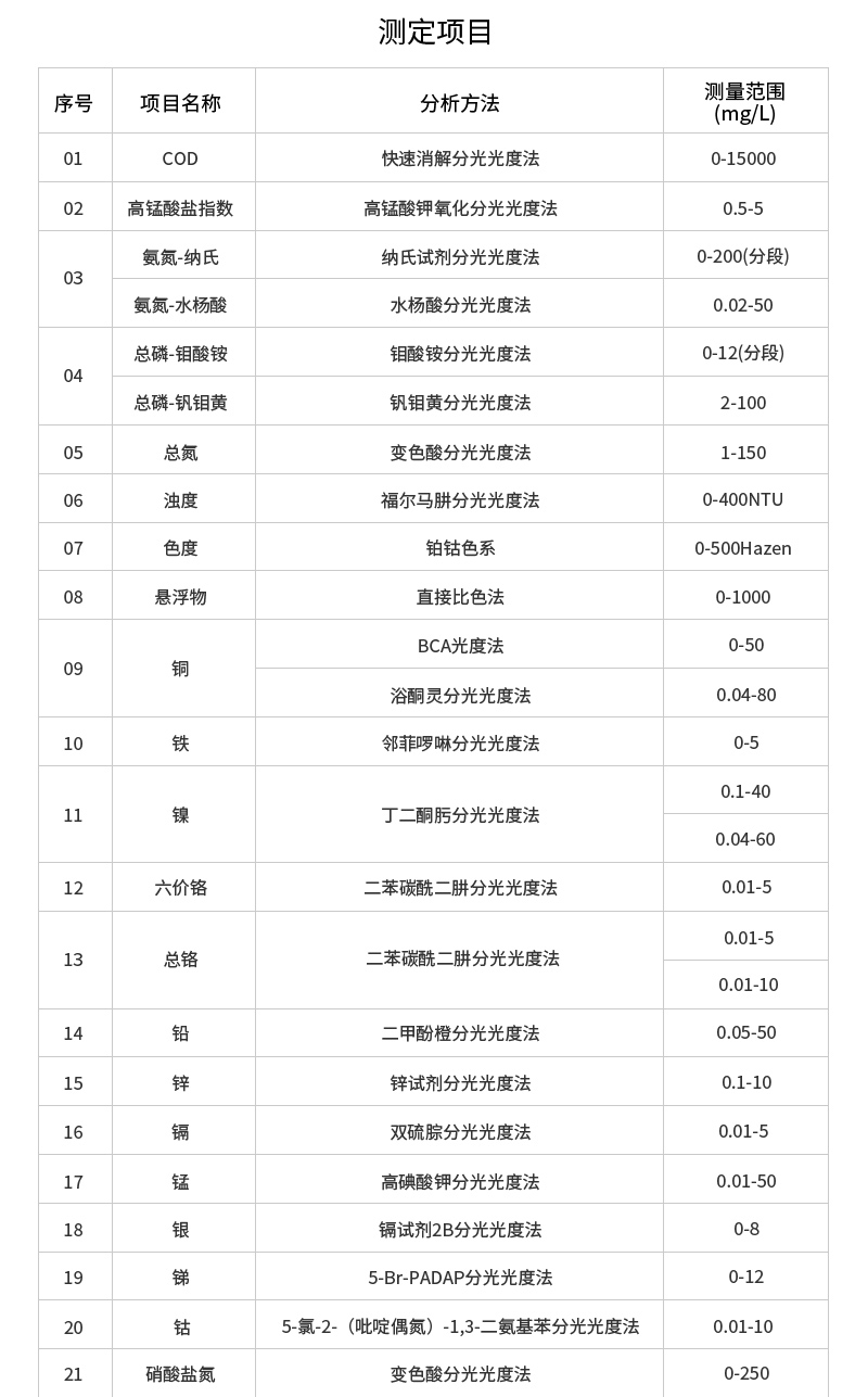 檢測限:COD高量程3mg/L;COD低量程0.5mg/L